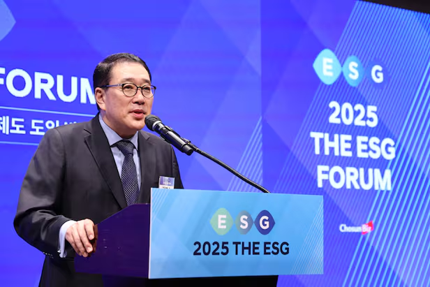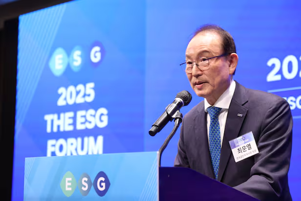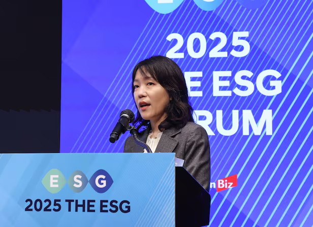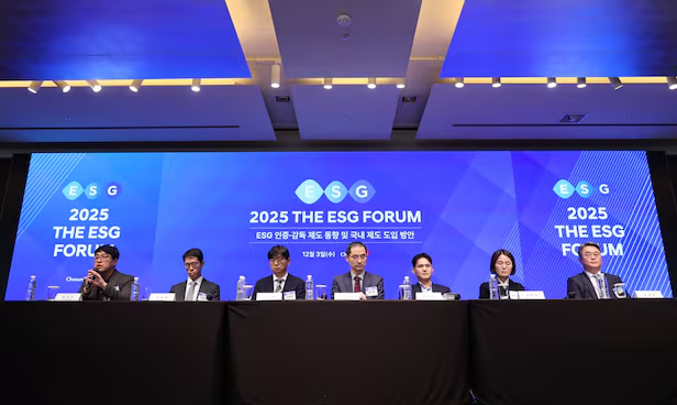 12월 3일 오전 서울 소공동 웨스틴 조선호텔에서 열린 '2025 THE ESG 포럼'에 참석한 패널 토론자들이 발언하고 있다. 왼쪽부터 권성식 한국표준협회 ESG 경영센터장, 오승재 서스틴베스트 공동대표, 김훈태 포스코홀딩스 경영전략실 상무보, 송민섭 서강대 경영학부 교수, 이웅희 한국회계기준원 지속가능성기준위원회 상임위원, 권미엽 삼일회계법인 서스테이너빌리티 팀 파트너, 송창영 법무법인(유) 세한 대표 변호사.