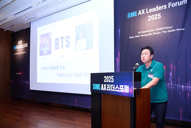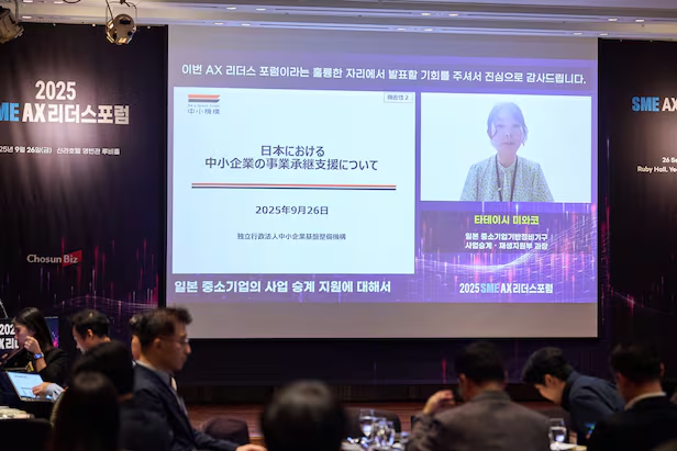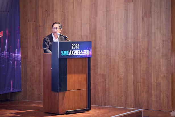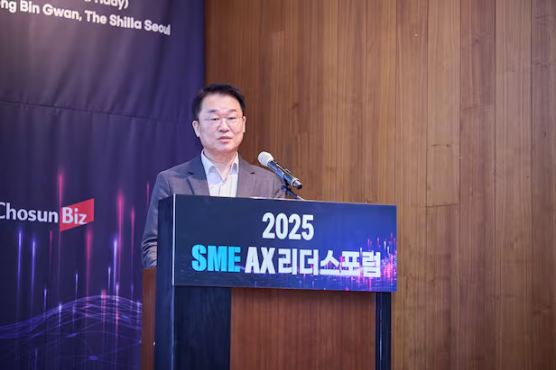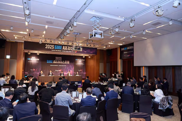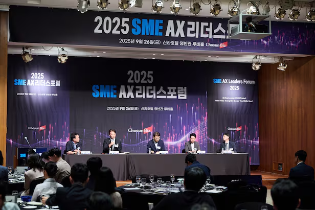 좌측부터 오경진 태림산업 대표이사, 김세훈 BCC글로벌 한국 대표, 김도현 국민대학교 경영대학원 원장, 부석준 경상국립대학교 컴퓨터공학부 교수, 박용순 중소벤처기업부 기술혁신정책관이 26일 서울 장충동 신라호텔에서 개최된 ‘SME AX 리더스 포럼’에서 종합토론을 하고 있다.
